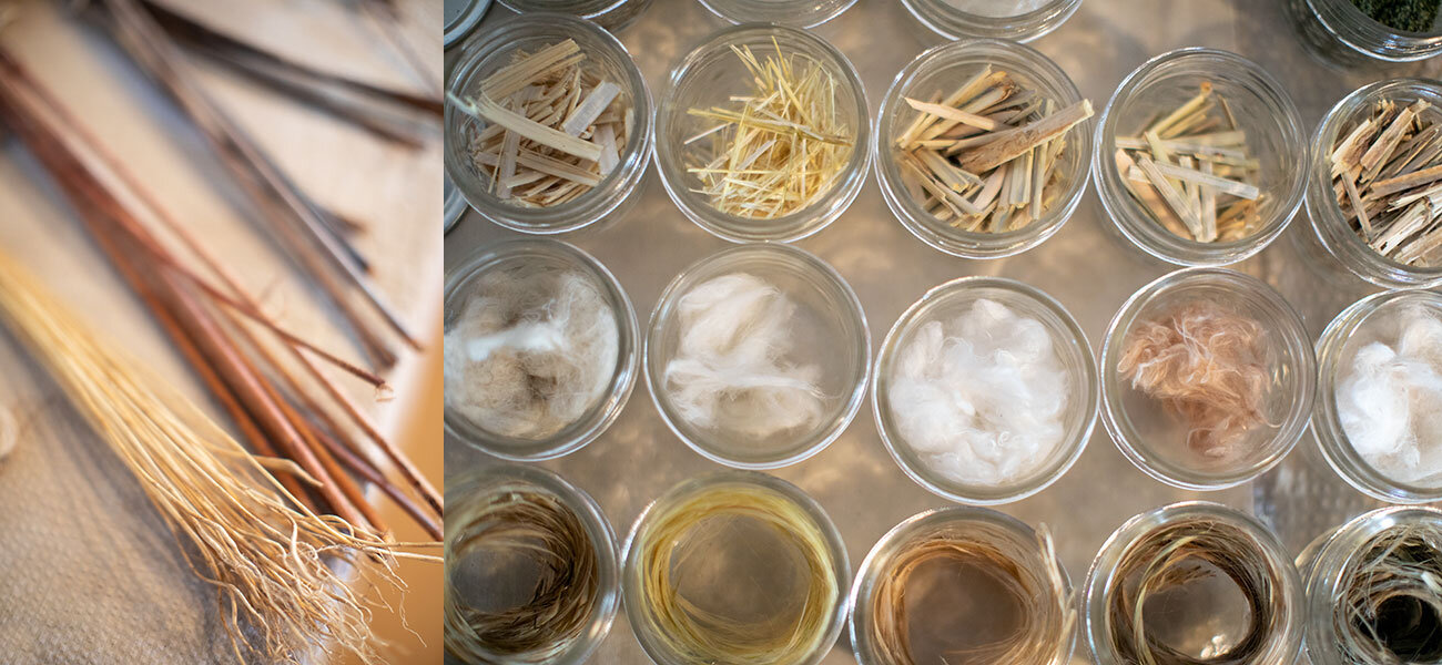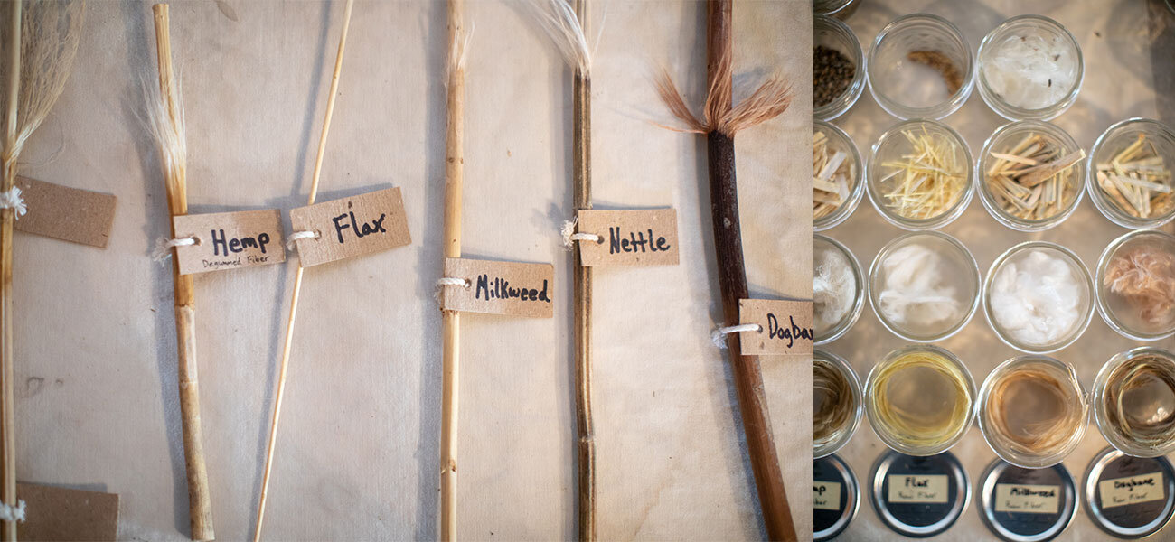 To process each plant, we decorticated the stalks by hand to separate the outer raw fiber from the inner woody core, then degummed the raw fiber using heat and a solution of water and alkali to remove lignin and other binding substances, and washed, dried, and carded the fiber into clean, spinnable fiber. We paired specimens of each plant with samples of raw fiber, degummed fiber, hurd, seeds, and other products, such as edible leaves from nettle and flower buds from hemp.