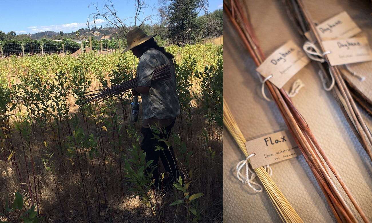 With permission and guidance from indigenous land tenders, we harvested dogbane for the Bast Fiber Exhibit from a patch in Sonoma County that has been continuously tended for thousands of years and is within the traditional and ancestral territory of Southern Pomo and Coast Miwok peoples. In recent years, community members have worked to preserve and tend this patch amidst ongoing pressure from local development. The site is now protected under the Sonoma County Agricultural Preservation and Open Space District, and volunteers tend the site throughout the year by clearing brush and weeds and otherwise maintaining habitat for the plant. The preserve hosts a day of cordage making and stewardship each winter, and you can read about a recent event here.