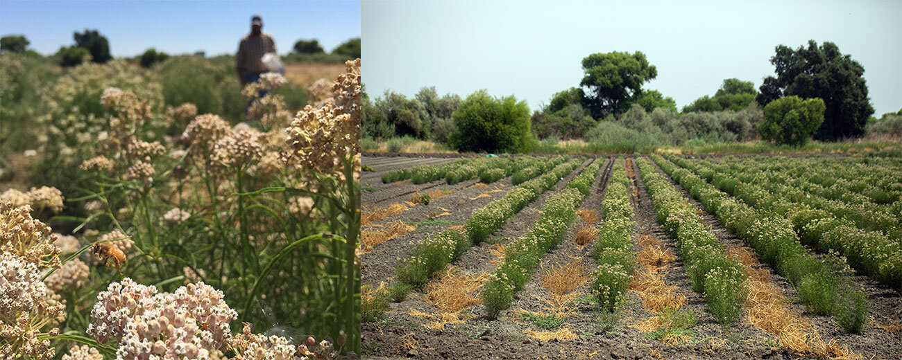 Many species of milkweed grow in a variety of habitats throughout North America. They are classified in the genus Asclepias, which sits in the same family as dogbane. At least 19 species grow in California, including narrow-leaf milkweed (Asclepias fascicularis), which can be found in dry, open areas throughout the state, and showy milkweed (Asclepias speciosa), which grows in more mountainous, wetter areas. Milkweeds are named for an abundant, milky-white latex “sap” that seeps from injured portions of the plant. The latex contains chemical compounds the plants use to fend off predation from insects and other animals. Most milkweed plants are toxic for human consumption due to these defenses, although some milkweed species may be made edible if properly processed.