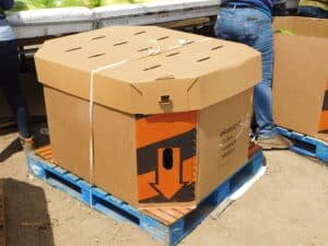 -The bins are covered with cardboard lids and palletized until further shipment