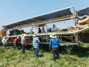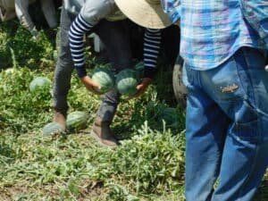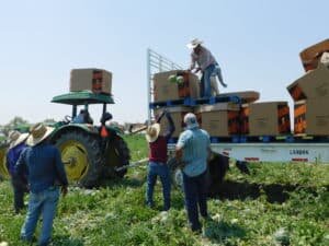 You will notice in the video below that the harvesters are just picking up the watermelons from the ground. They are able to do this because a cutting crew went through the field beforehand and cut all of the watermelons so that the harvest crew would only have to lift up the melons and hand them off to the packers.