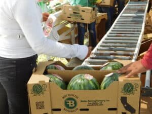 For the first watermelon harvest and packing method, the watermelons are harvested and placed on the packing table of the harvesting rig. The packers then place the watermelons into the boxes, or into bags and then boxes. The watermelons all receive sticker labels and are sent on a conveyor over to the adjacent trailer to be packed.