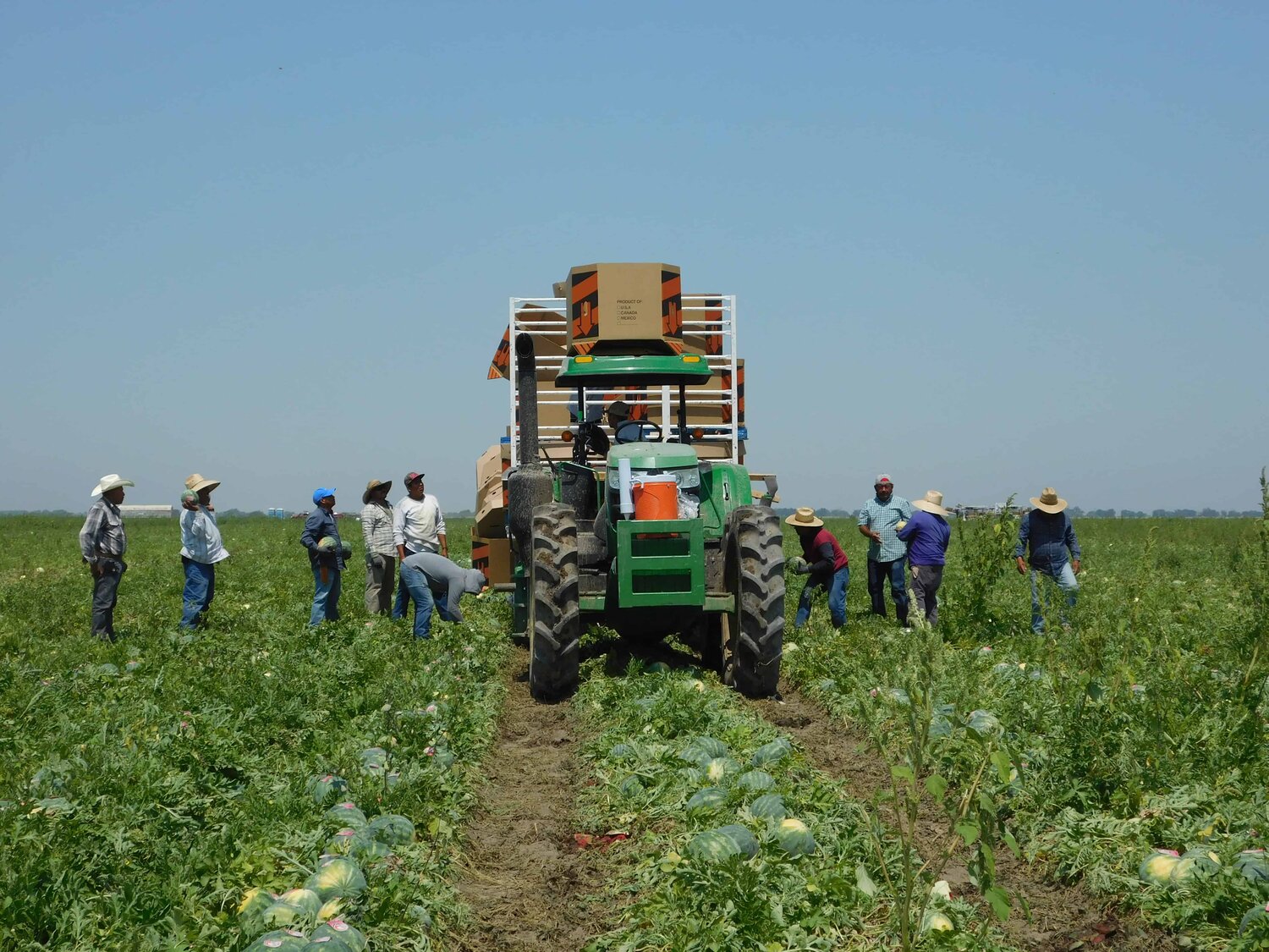 There were two different types of watermelon harvesting and packing taking place in the field: